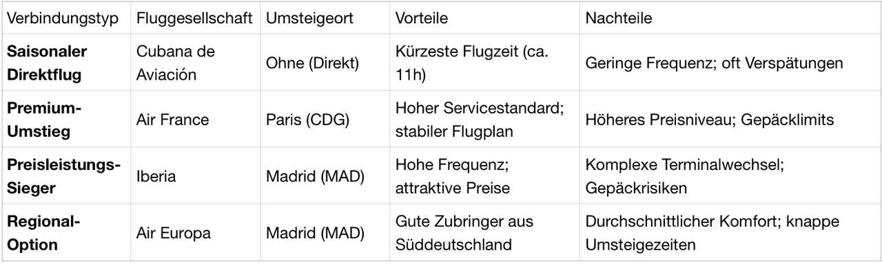 Saisonaler Direktflug (Cubana de Aviación) Route: Direkt ab Frankfurt (FRA) Vorteile: Kürzeste Flugzeit (ca. 11h) Nachteile: Geringe Frequenz; oft Verspätungen; Gepäck-Neuaufgabe in FRA nötig.