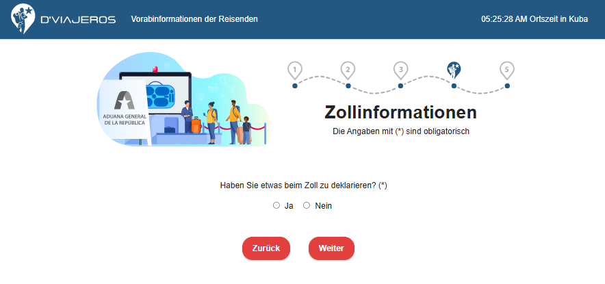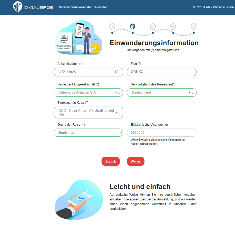 Warnung: Füllen Sie es nicht erst am Flughafen in Kuba aus! Das Internet dort ist oft nicht vorhanden. Machen Sie es entspannt zu Hause.